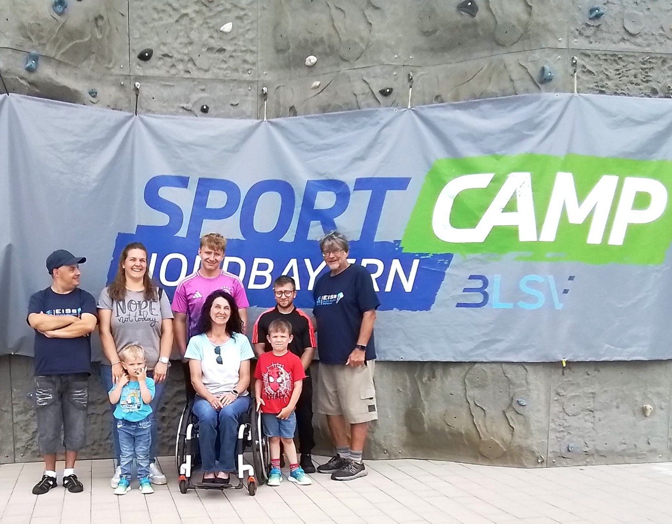 Beeindruckt von den vielen Sportmöglichkeiten: Mitglieder der Mitterteicher „Erlebten inklusiven Sportschule“ hier vor der 18m- hohen Kletterwand im BLSV-Camp in Bischofsgrün